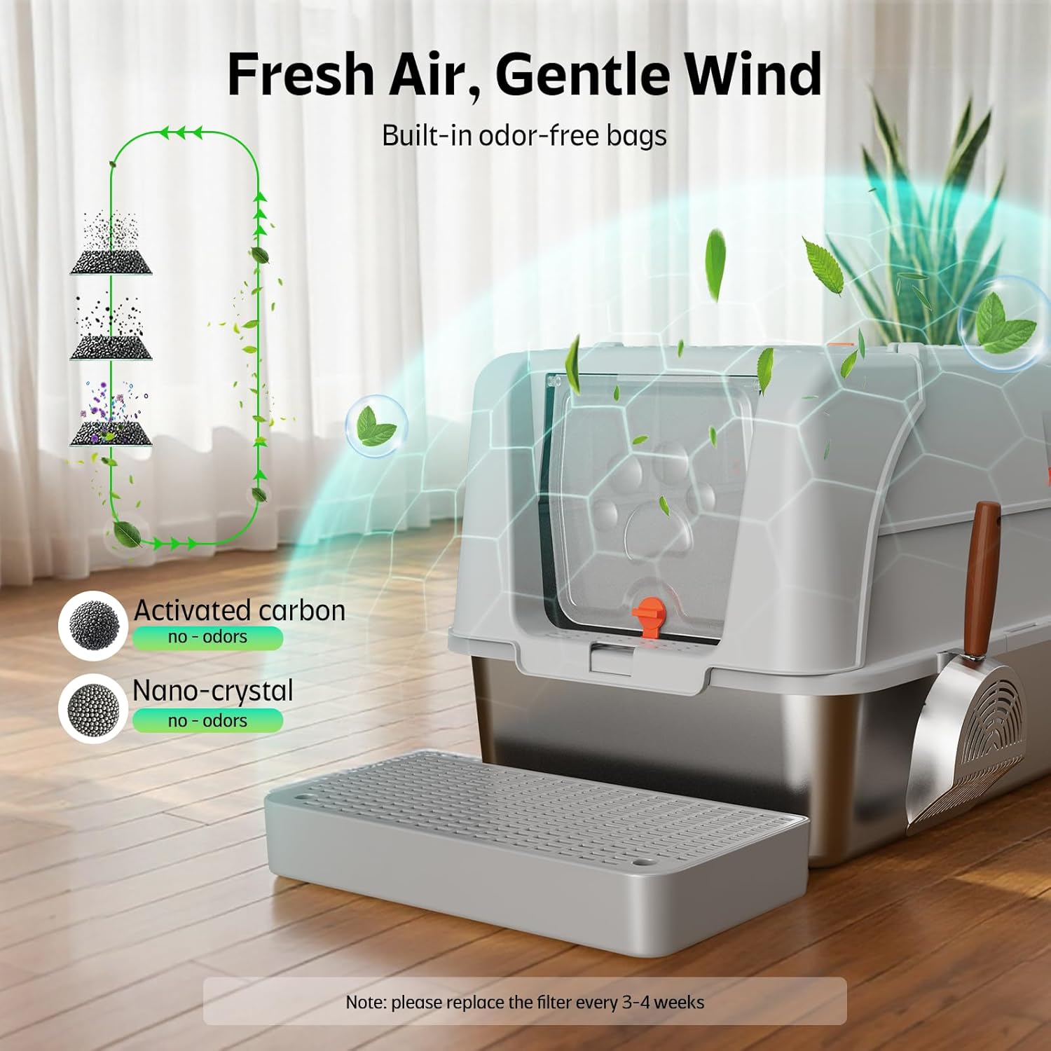 Premium Stainless Steel Litter Box – Extra-large, durable metal design with 6" high sides and 4" top cover for 100% urine-proof protection. Easy to clean and odor-resistant.